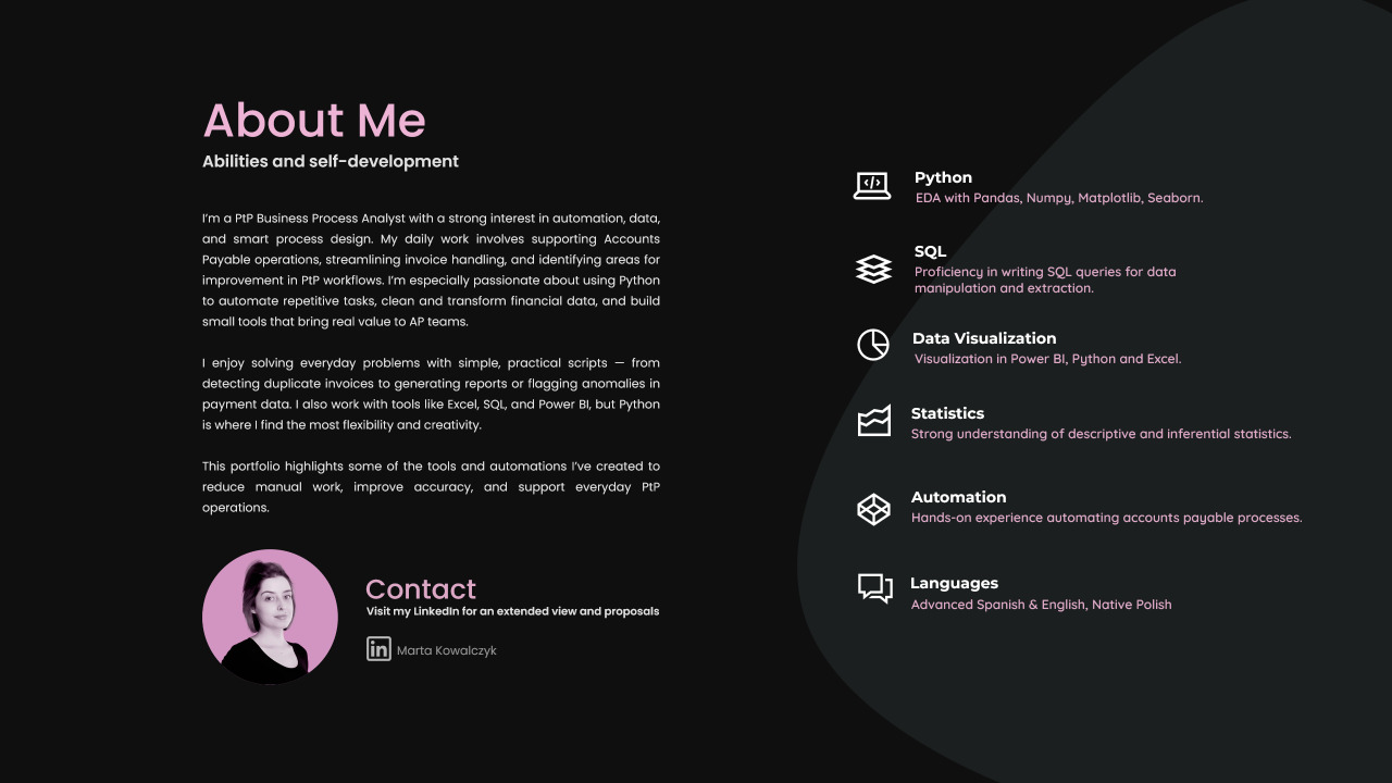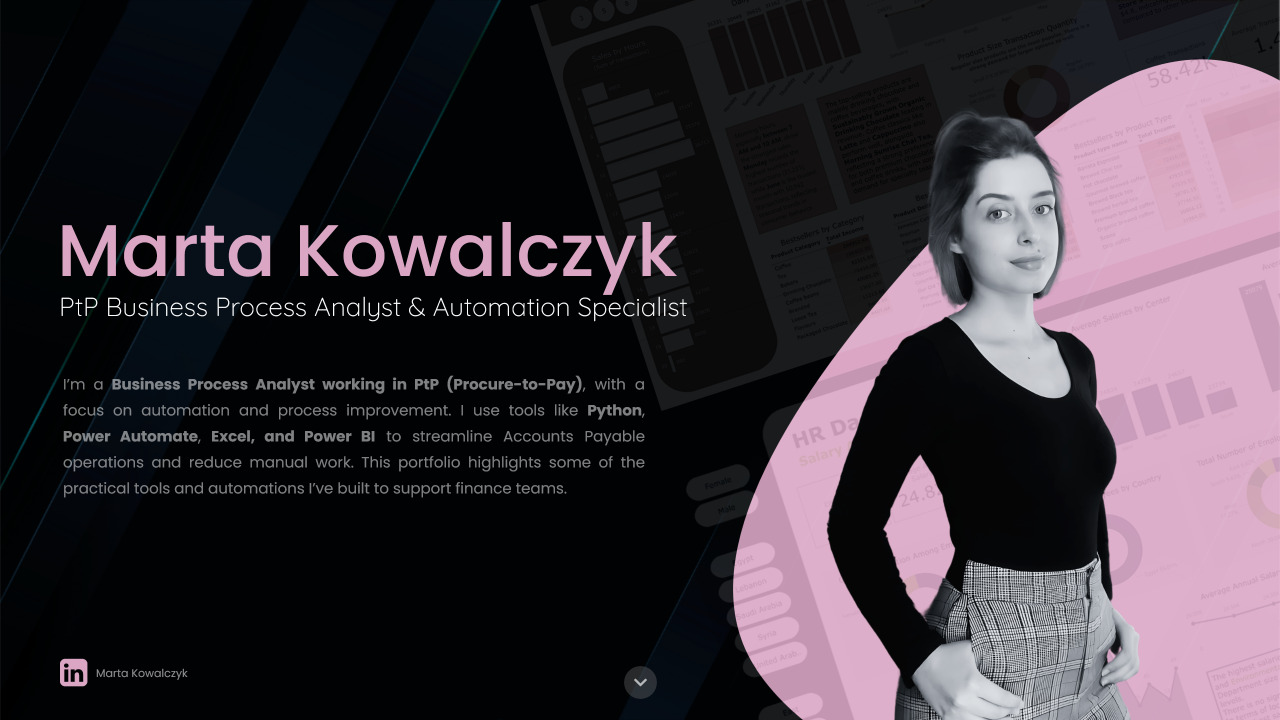 I’m a Business Process Analyst working in PtP (Procure-to-Pay), with a focus on automation and process improvement. I use tools like Python, Power Automate, Excel, and Power BI to streamline Accounts Payable operations and reduce manual work. This portfolio highlights some of the practical tools and automations I’ve built to support finance teams.